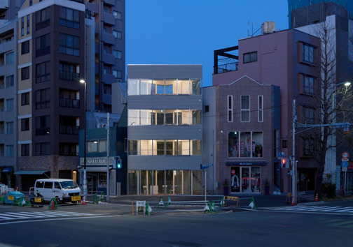 賑やかな交差点の角に、ミニチュアのビルを置いたようなかわいらしい建物です。ひとフロア4坪にも満たない小さな空間ですが、柱を細く分散してガラス枠を兼ね、隣地とのあいだを抜けるような階段を設けるなど、考え抜かれたシンプルな構成で、建築的な制約を感じさせない開放感を実現させています。建物に使われている材料は、電柱や信号機など、交差点にすでにある素材に揃えられています。整備が予定されている前面歩道の材料を調査し、全く同じ物をあらかじめ敷地内の地面に敷いておくなど、風景との連続性が徹底されています。